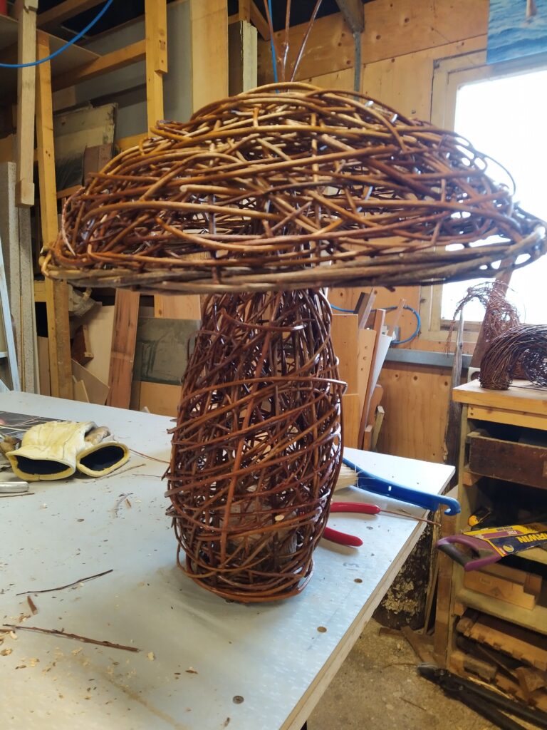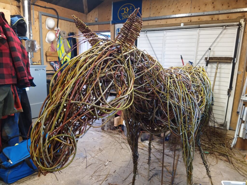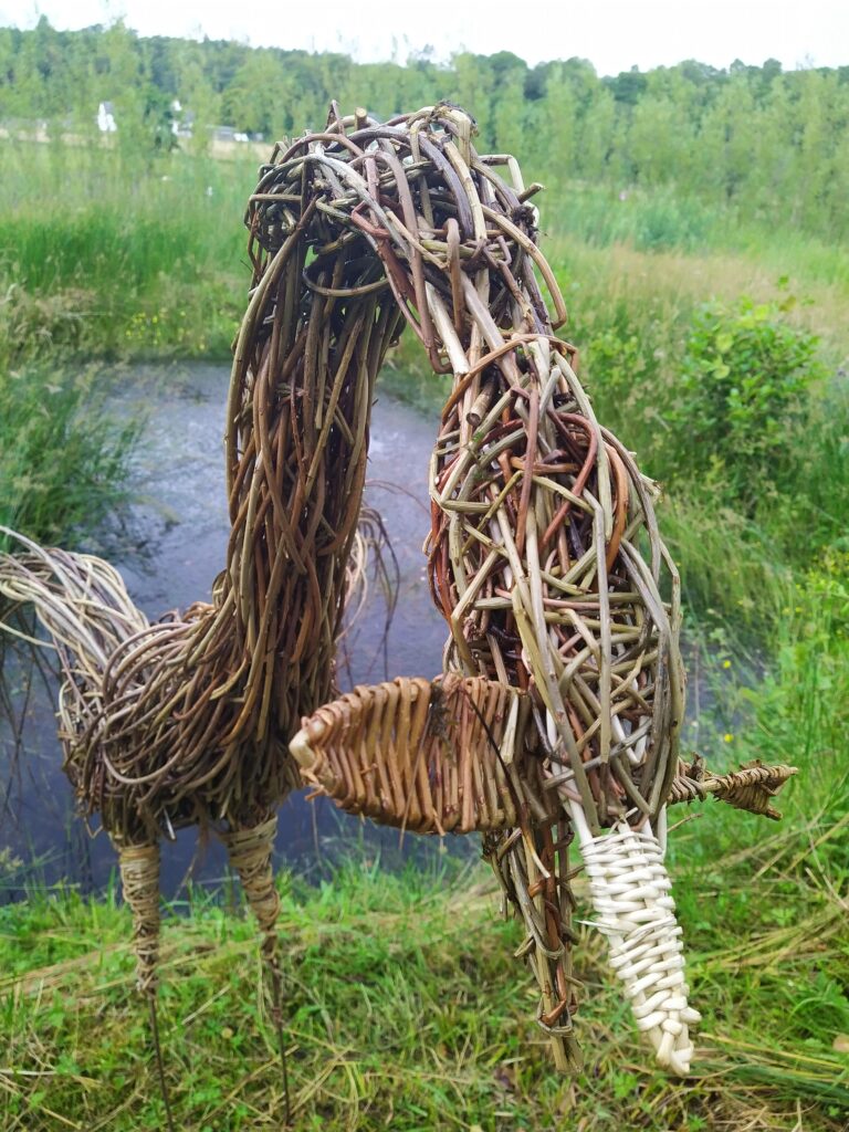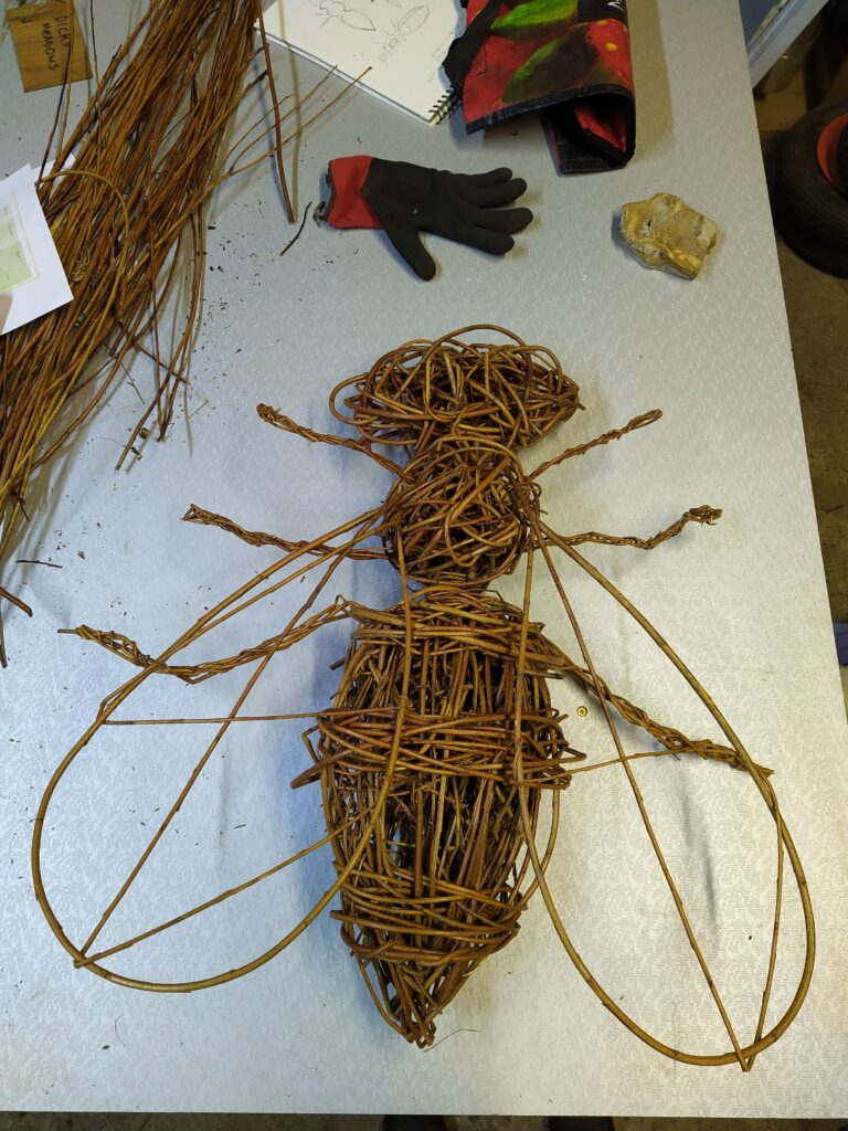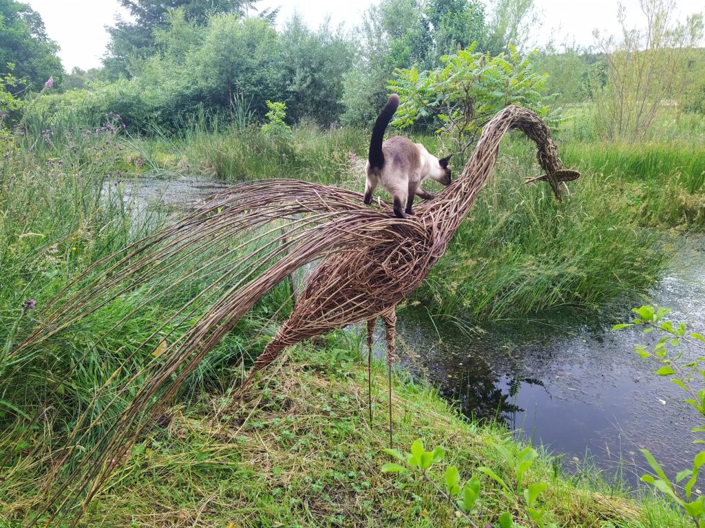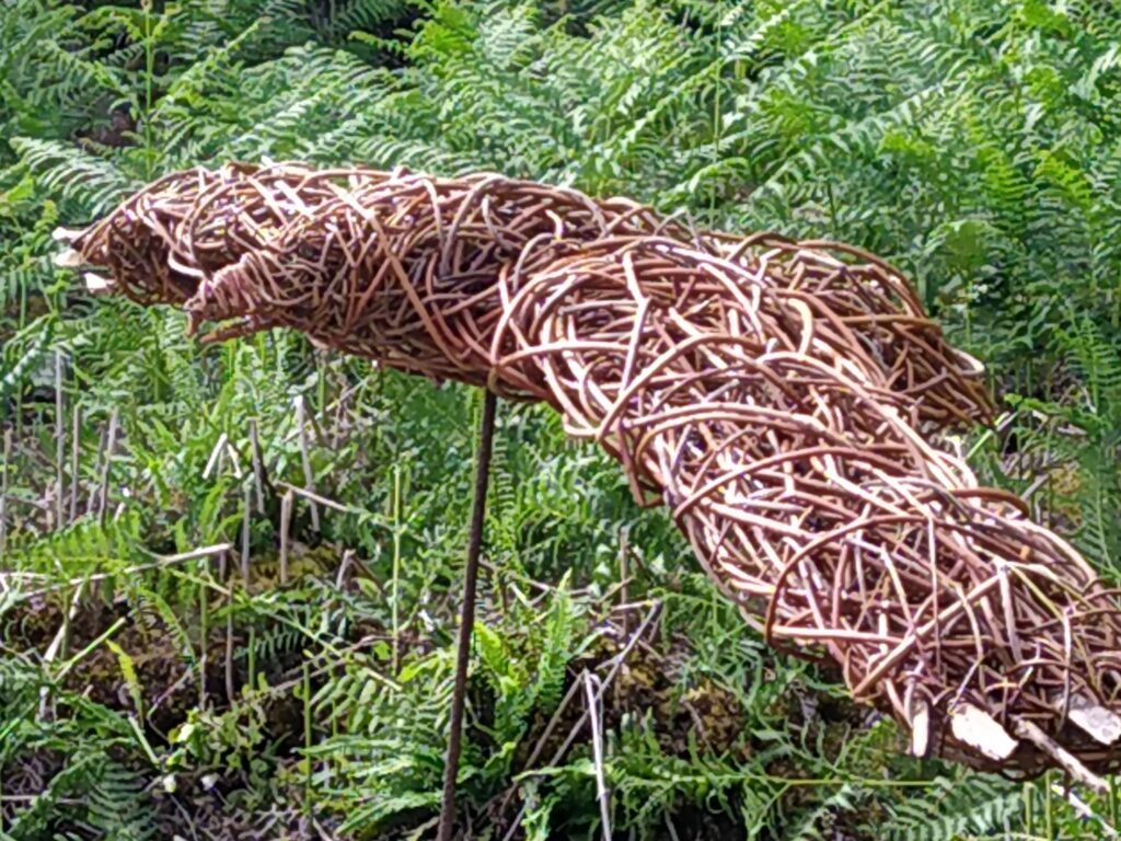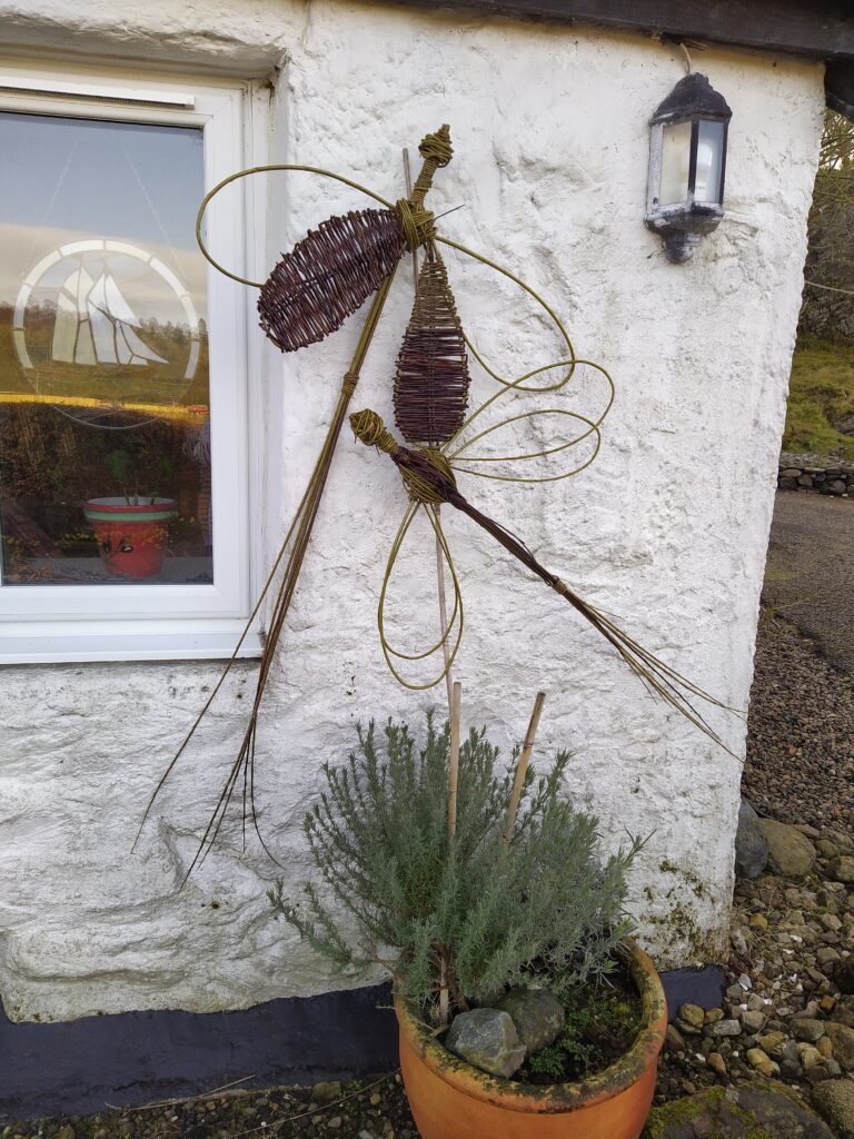 Sorry about the rather sad looking wing on one of the dragonflies. It was a tough winter and I didn’t notice when I was taking the photo. Anyway, it shows the reality of making things from willow. In the right circumstances willow can last a long, long time, but sitting outside exposed to wind, rain, sun and frost you can see them age over the seasons.